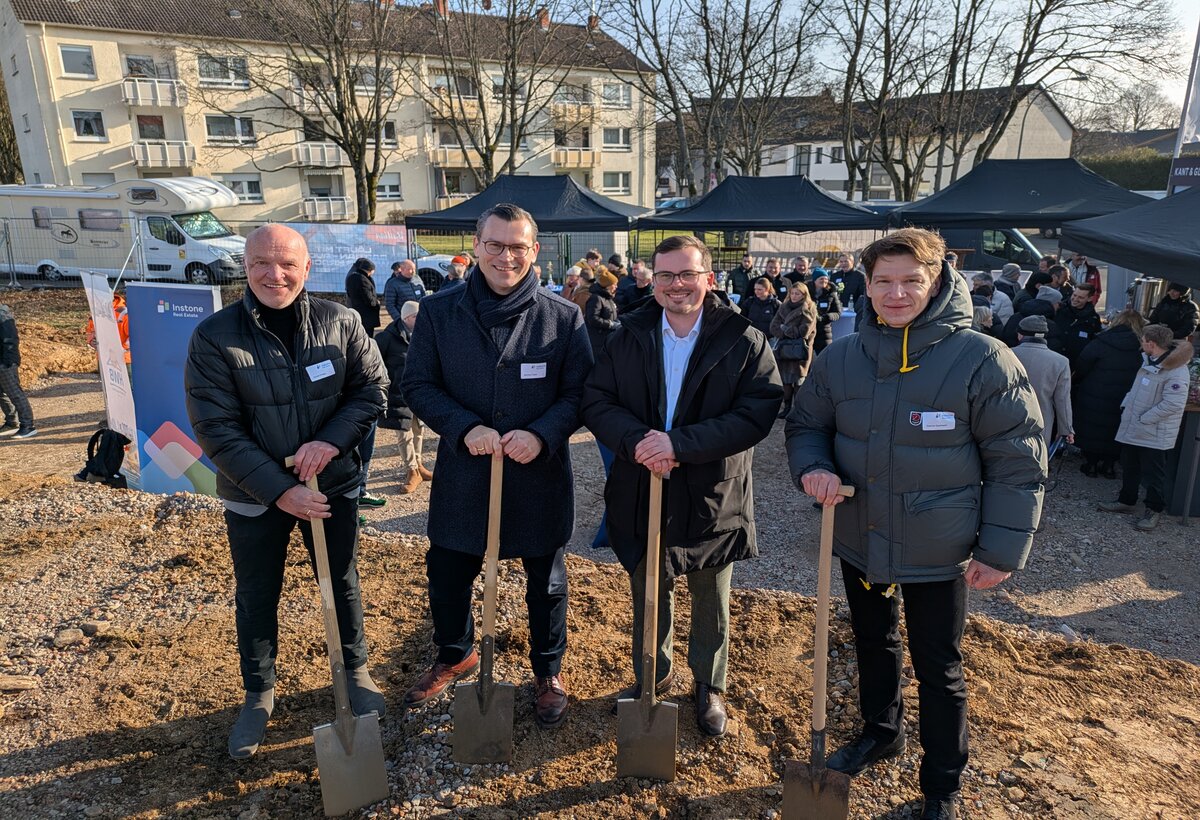 Mit dem heutigen Spatenstich beginnen die Bauarbeiten für ein Wohnhaus mit 20 geförderten Wohnungen und einer dreizügigen Kindertagesstätte an der Homburger Straße in Hofheim am Taunus. Das Gebäude ist Teil des neuen Quartiers „Kant & Gloria“ und wird vom deutschlandweit tätigen Wohnentwickler Instone Real Estate („Instone“) für die Hofheimer Wohnungsbau GmbH (HWB) realisiert. Neben dringend benötigten Mietwohnungen entstehen bis zu 49 Kita-Betreuungsplätze sowie Tiefgaragen- und Außenstellplätze. Am feierlichen Termin nahmen Bürgermeister Wilhelm Schultze, Erster Stadtrat Daniel Philipp, Norman Diehl, Vorsitzender der HWB-Geschäftsführung, und Sascha Querbach, Niederlassungsleiter Rhein-Main von Instone Real Estate, teil.