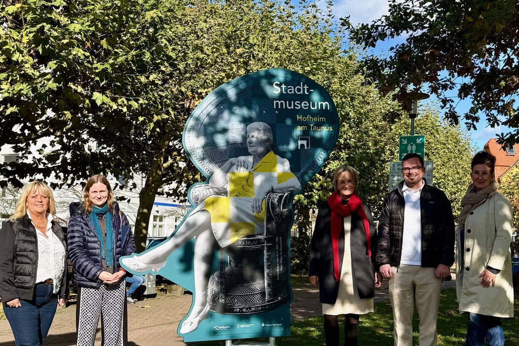Hanna Bekker vom Rath war eine der großen Hofheimer Künstlerpersönlichkeiten. Ihr Leben ist untrennbar mit der Kreisstadt verknüpft. Das bringt die Stadt Hofheim nun mit sieben besonderen Installationen zum Ausdruck: In jedem Stadtteil und in der Kernstadt werden für etwa ein Jahr zwei Meter hohe Stelen aufgestellt. Das Motiv ist vielen Hofheimerinnen und Hofheimern vertraut: Es handelt sich um die Schwarz-weiß-Fotografie „Hanna Bekker im Pfauenthron“, die die Fotografin Helga von Brauchitsch 1968 angefertigt hat. Das Bild, das die Künstlerin in einem Korbstuhl zeigt, zierte auch die Postkarten, die zum 30-jährigen Bestehen des Stadtmuseums gedruckt wurden, und das Weinetikett des „Diedenbergener Sonnenhangs“ aus dem Jahr 2022.