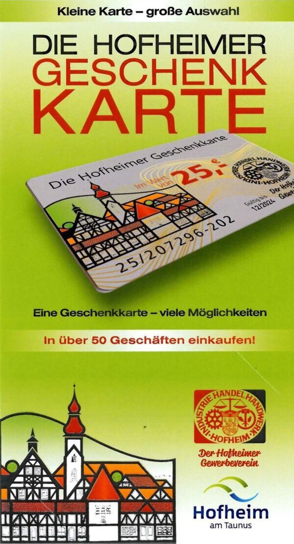 Eine Geschenkkarte – viele Möglichkeiten. Die Hofheimer Geschenkkarte ist ein voller Erfolg. Diese Möglichkeit, in vielen Hofheimer Fachgeschäften einzukaufen, wird von immer mehr Kunden genutzt. Durch die große Anzahl von Fachgeschäften bietet die Hofheimer Geschenkkarte für Inhaber der Karte eine riesen Auswahl und viele Einsatzmöglichkeit.