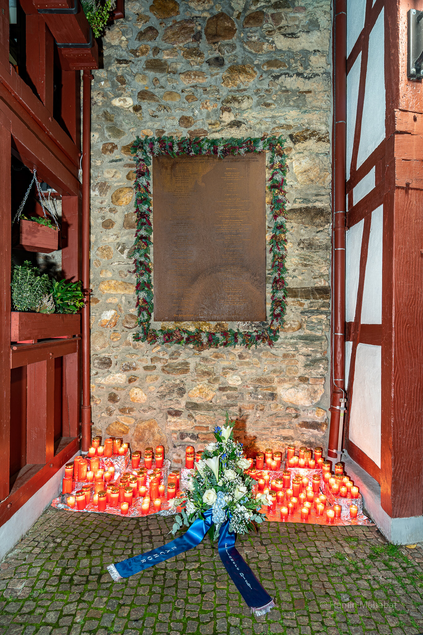 Zur Erinnerung an die Menschen im heutigen Main-Taunus-Kreis, die in dieser Nacht der Zerstörung gelitten haben und nach der Reichspogromnacht vertrieben oder ermordet worden sind, werden Kerzen an die Mauer der ehemaligen Synagoge unter die Gedenktafel mit ihren Namen aufgestellt.
